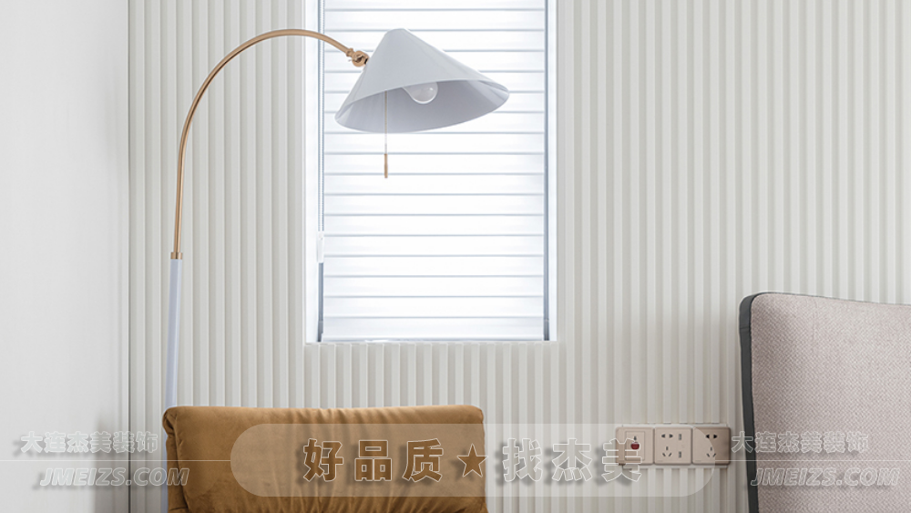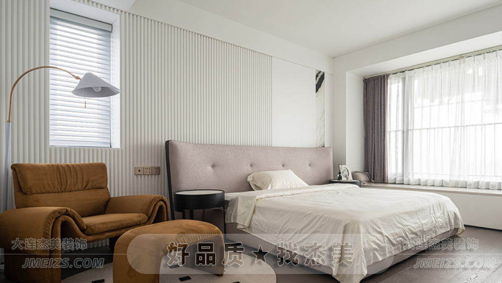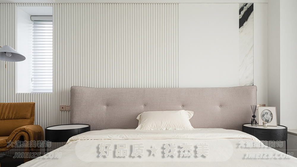 本案臥室設(shè)計,杰美裝飾設(shè)計師延續(xù)了整體簡約大方的設(shè)計風(fēng)格。白色的木格柵與護(hù)墻板徐徐鋪開,連續(xù)而又有間隙的自然縫造型讓幾何之美得以充分展現(xiàn)。