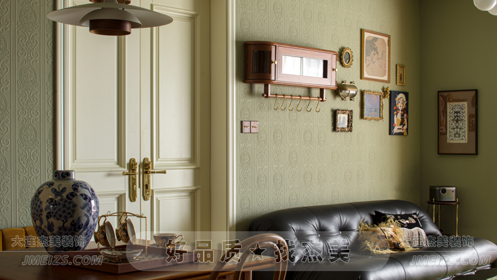 本案在設(shè)計(jì)風(fēng)格上,我們杰美裝飾設(shè)計(jì)師融合了王家衛(wèi)電影的藝術(shù)美感和復(fù)古氛圍。線條雕塑、壁紙和海吉布被用來覆蓋原始?jí)γ?,保留了墻體的本真,卻減少了痕跡的顯露。