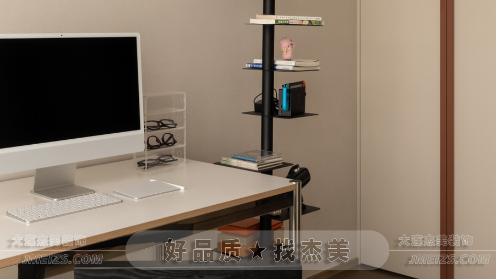 書房采用簡單的陳設滿足基礎需求,營造寧靜和安逸的氛圍。墻面打造了一個頂天立地的收納柜,柜門與墻面同色,視覺上融為一體。同時點綴著簡約的木條裝飾,豐富了空間的層次感。