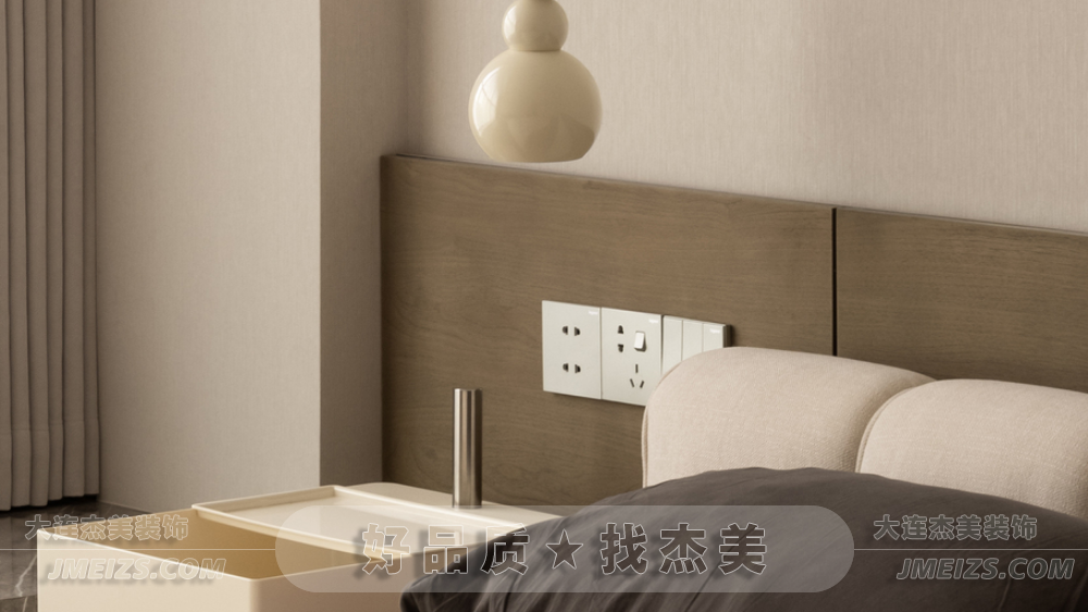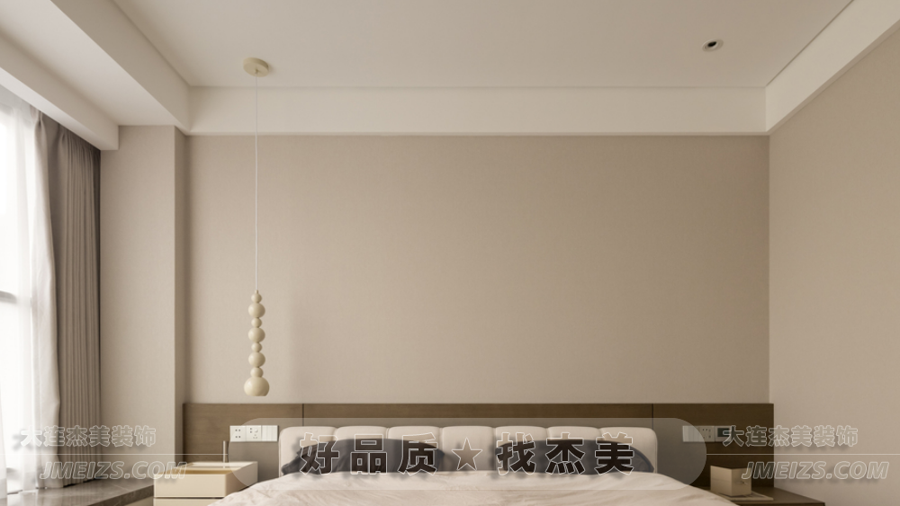 主臥室溫馨純凈,以奶茶色和淡雅白色為基調,營造簡約色系的寧靜治愈感。床頭背后采用原木飾面板,展現現代主義下的自然美學。