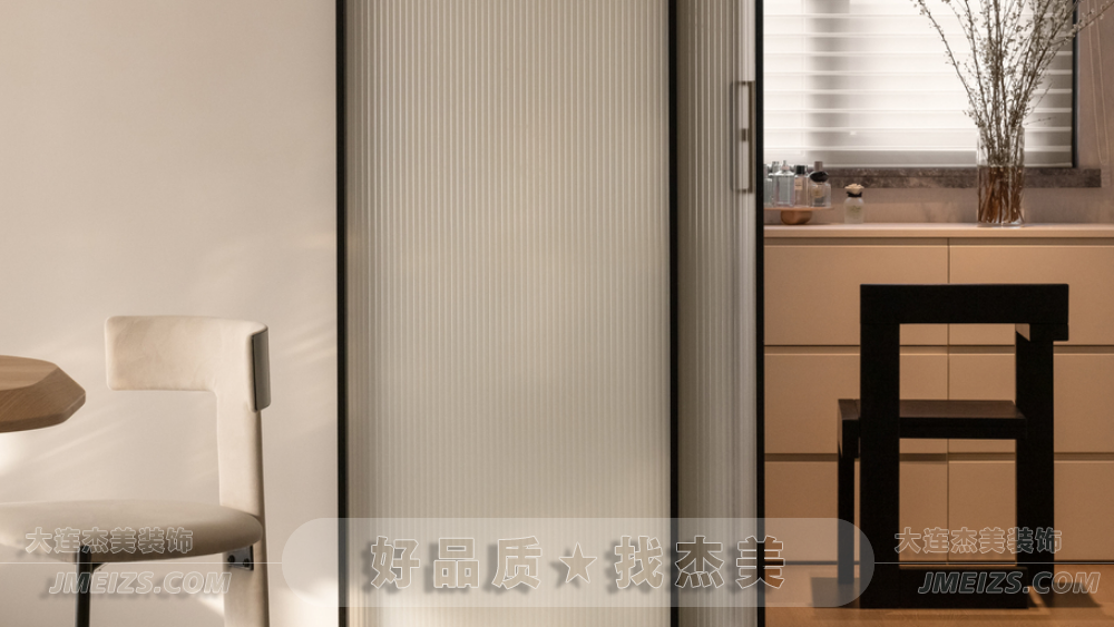 在廚房一側,杰美裝飾設計師設計了一個小型步入式衣帽間,外側采用長虹玻璃幽靈門,確??臻g寬敞通透。內部的兩側墻面用作衣柜,中間臨窗區(qū)域的抽屜柜兼具梳妝臺功能,百葉簾引入朗朗的日光,讓空間流露出時尚現代的感覺。