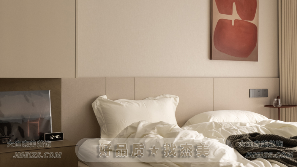 次臥采用無床頭設計,用硬包代替床頭靠背,背景墻搭配一幅藝術肌理畫,深色調為空間增加視覺重點。柜體采用懸浮式設計,與不同色彩組合,打造出和諧的美學秩序,為家居增色的同時提升了生活的儀式感。