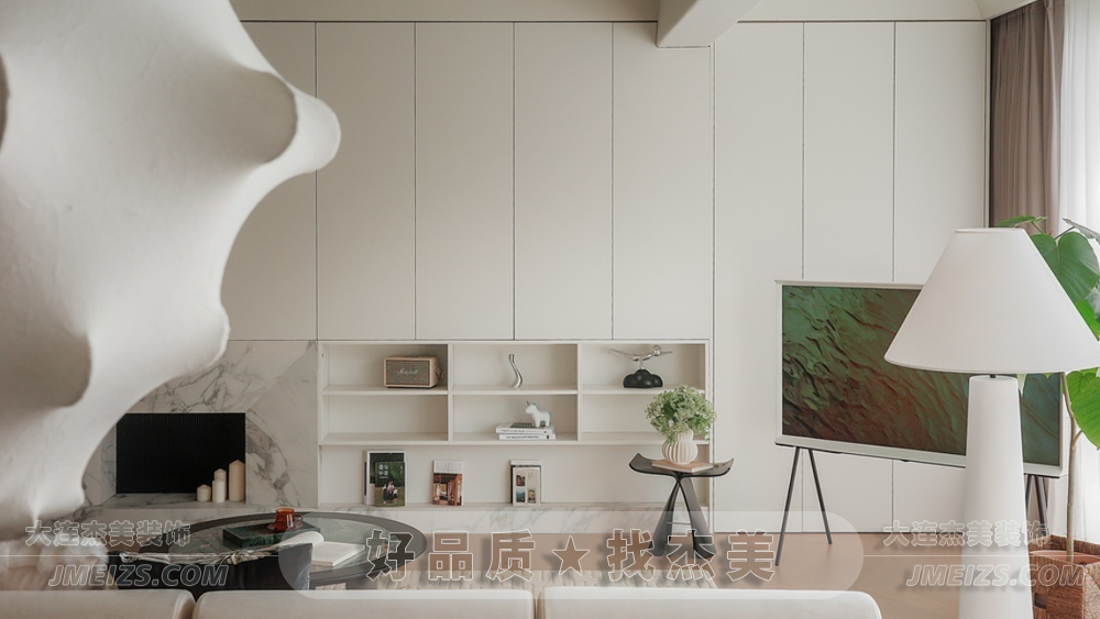 電視柜背景墻設(shè)計(jì)為2.76米到頂?shù)氖占{柜,隱藏儲(chǔ)物空間同時(shí)滿足日常收納需求。一旁的置物架上擺放著居者收藏的來(lái)自世界各地的美物,設(shè)計(jì)兼顧了功能性和美觀性。